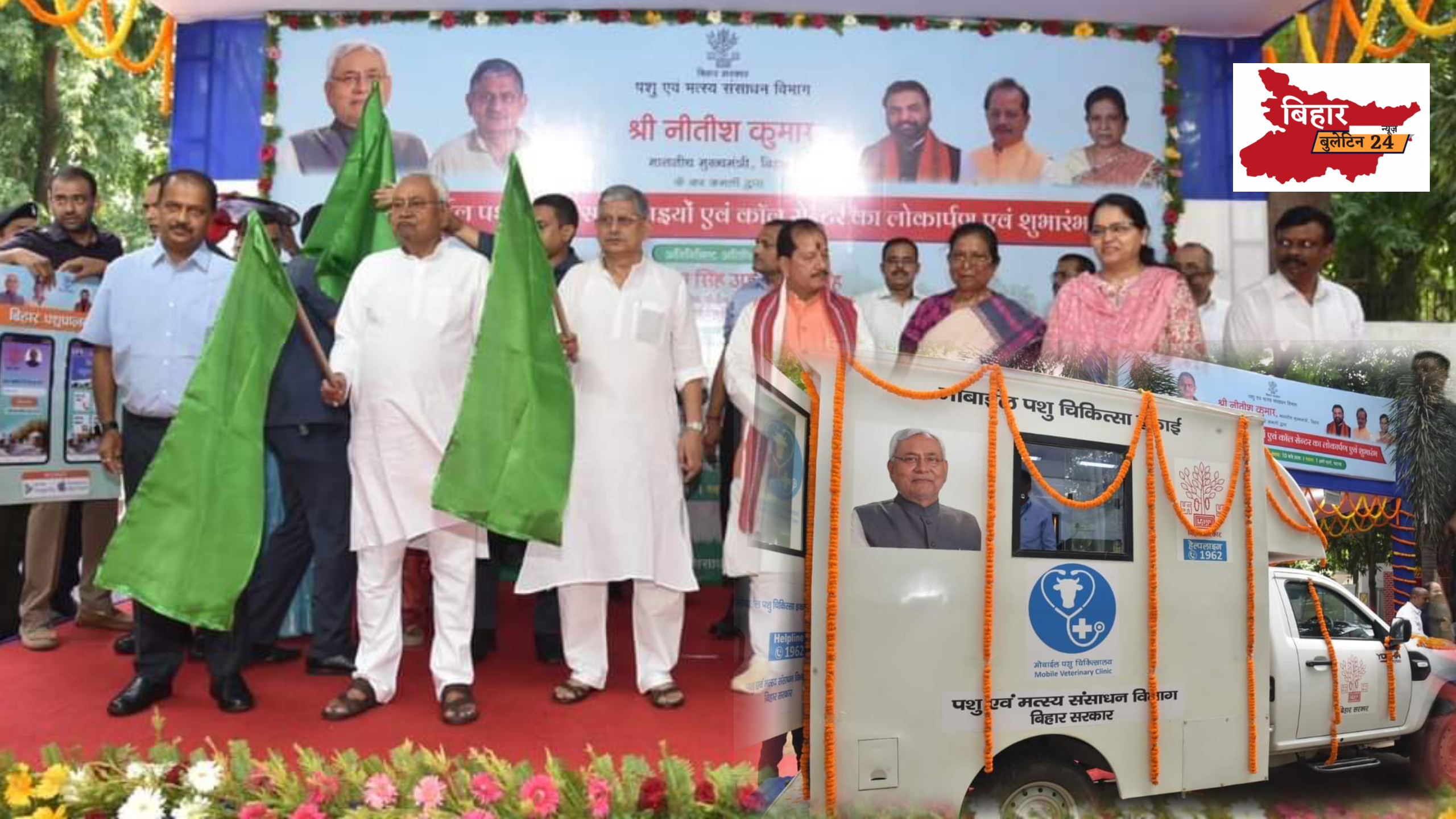 पटना 09 सितम्बर 2024 :- मुख्यमंत्री नीतीश कुमार ने आज 01 अणे मार्ग से मोबाइल पशु चिकित्सा कॉल सेंटर के शिलापट्ट का अनावरण कर उदघाटन किया। इस अवसर पर मुख्यमंत्री ने 534 मोबाईल पशु चिकित्सा इकाईयों (वाहनों) को हरी झंडी दिखाकर रवाना किया। मोबाइल स्क्रीन को क्लिक कर मुख्यमंत्री ने बिहार पशुपालक एप्प एवं किसान पशुपालक एप्प का लोकार्पण किया। पशु एवं मत्स्य संसाधन विभाग की प्रधान सचिव डॉ० एन० विजयलक्ष्मी ने मुख्यमंत्री को पौधा भेंटकर उनका अभिनंदन किया। मुख्यमंत्री ने इसके पूर्व मोबाइल पशु चिकित्सा इकाइयों का मुआयना कर इनमें उपलब्ध करायी गई सुविधाओं एवं पशुपालकों को प्रदान की जानेवाली सेवाओं के संबंध में अधिकारियों से जानकारी ली।