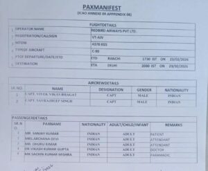 एयर एंबुलेंस में जिस मरीज को लेकर रांची से दिल्ली जा रही थी, उनकी पहचान लातेहार के चंदवा निवासी संजय कुमार के रूप में हुई है. संजय रांची के देवकमल हॉस्पिटल में भर्ती थे. उनके साथ अर्चना देवी, धुरु कुमार नामक दो परिजन थे. इसके अलावा पायलट की पहचान कैप्टन विवेक विकास भगत और कैप्टन सवराजदीप सिंह के रूप में हुई है.
