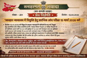 दिनांक-15.03.2026 को बिहार के व्यवहार न्यायालयों में परिचारी के पद पर नियुक्ति हेतु प्रारंभिक जांच परीक्षा आयोजित होगी। नवादा जिला में कुल 23 परीक्षा केन्द्रों पर दो पालियों (प्रथम पाली 10ः00 बजे पूर्वाह्न से 12ः00 बजे मध्याह्न तक एवं द्वितीय पाली 02ः00 बजे अपराह्न से 04ः00 बजे अपराह्न तक) में परीक्षा आयोजित की जायेगी। परीक्षा कदाचारमुक्त, स्वच्छ एवं शांतिपूर्ण वातावरण में आयोजन एवं विधि-व्यवस्था संधारण हेतु जिला पदाधिकारी श्री रवि प्रकाश एवं पुलिस अधीक्षक श्री अभिनव धीमान के द्वारा संयुक्त आदेश जारी किया गया है। सभी परीक्षा केन्द्रों पर स्टैटिक दंडाधिकारी (पुरुष/महिला) एवं पुलिस पदाधिकारियों, कार्यपालक दंडाधिकारी/पुलिस पदाधिकारी की प्रतिनियुक्ति की गयी है। साथ ही सभी केन्द्रों पर पर्यवेक्षक की भी प्रतिनियुक्ति की गयी है। किसी भी परिस्थिति में किसी भी परीक्षार्थी को प्रथम पाली के लिए 09ः30 बजे पूर्वाह्न एवं द्वितीय पाली के लिए 01ः30 बजे अपराह्न के बाद प्रवेश की अनुमति नहीं दी जायेगी।